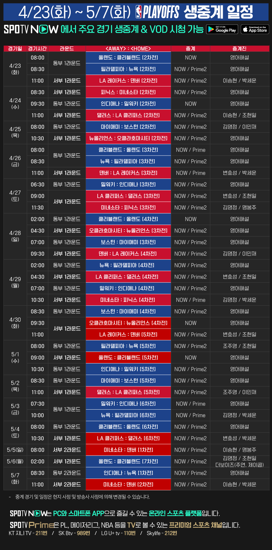 23-24 NBA 플레이오프 전 경기 PC/모바일 생중계는 SPOTV NOW에서 만나실 수 있습니다.