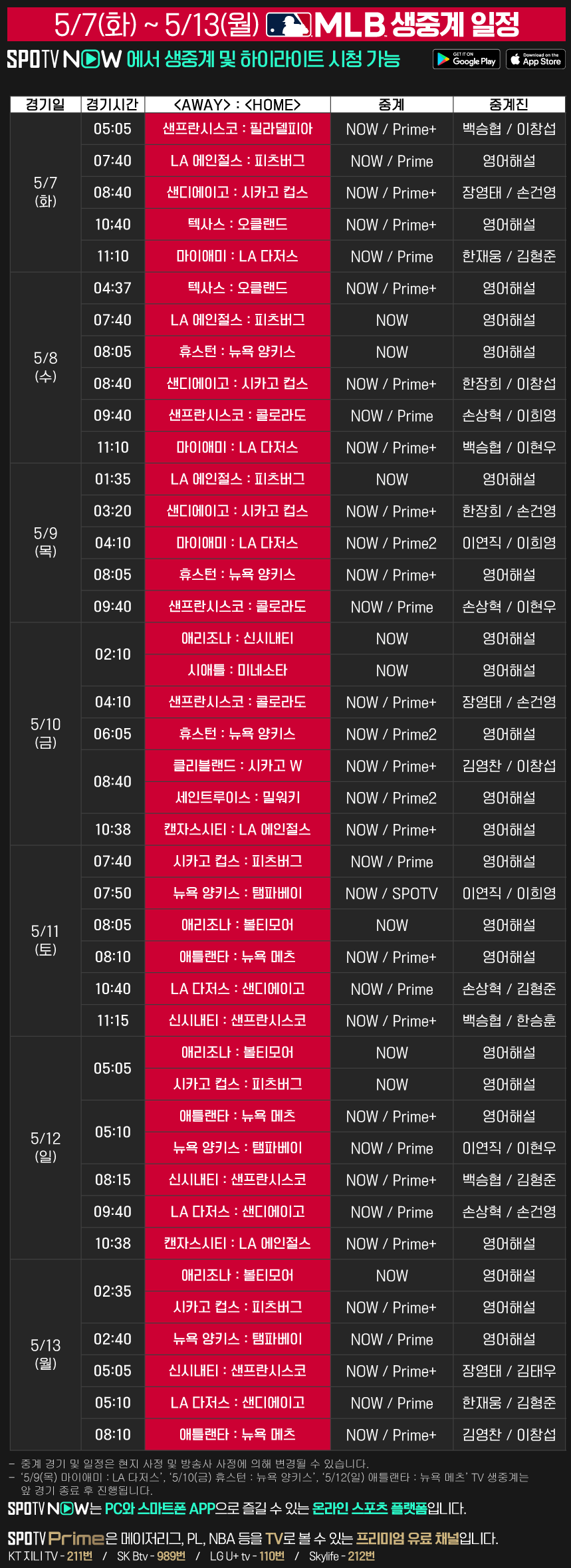5/7(화) ~ 5/13(월) 2024 메이저리그 생중계 안내 (이정후 중계 포함)2024-05-07