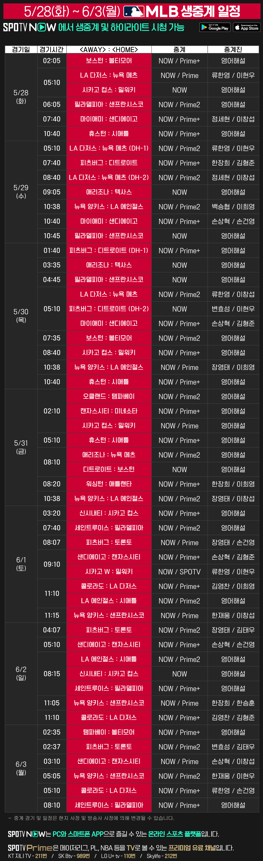 2024 메이저리그 주요 경기 생중계를 TV 채널 SPOTV Prime와스포츠 OTT 서비스 SPOTV NOW에서 만나보세요
