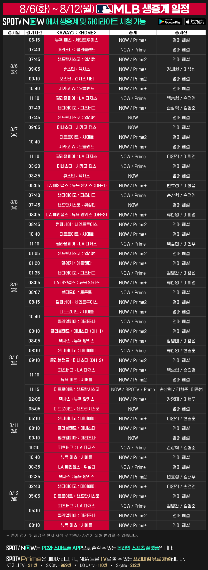 2024 메이저리그 주요 경기 생중계를 TV 채널 SPOTV Prime와 스포츠 OTT 서비스 SPOTV NOW에서 만나보세요.