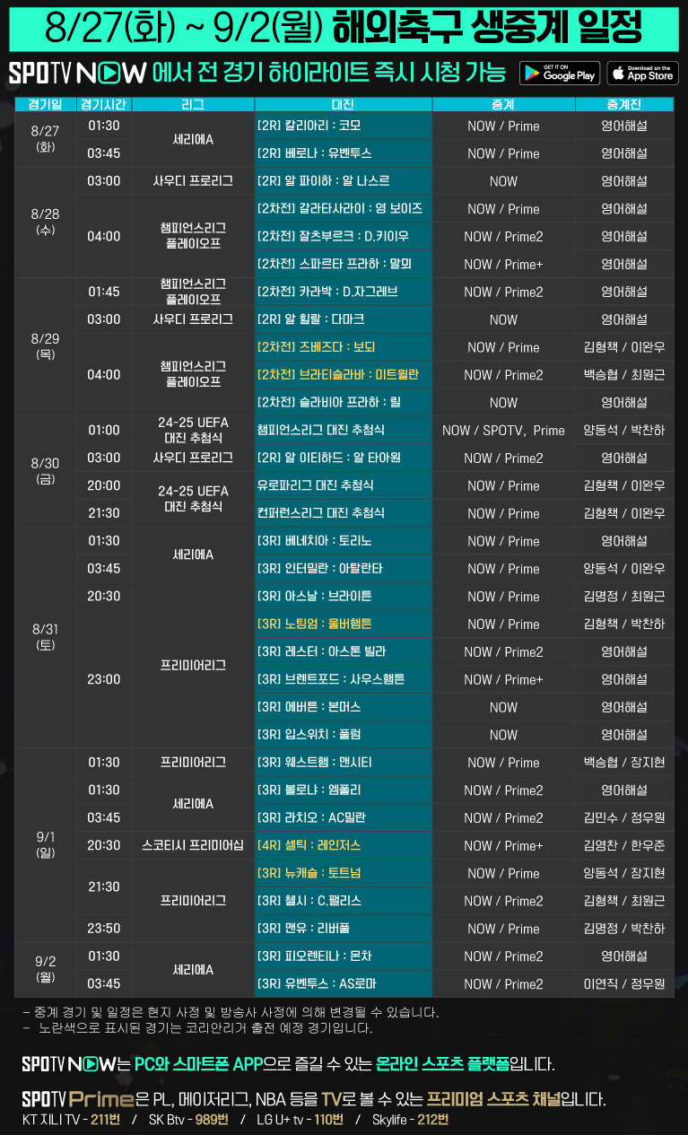 24-25 시즌 해외축구 주요 경기 생중계는 SPOTV Prime과 SPOTV NOW에서 만나보실 수 있습니다.