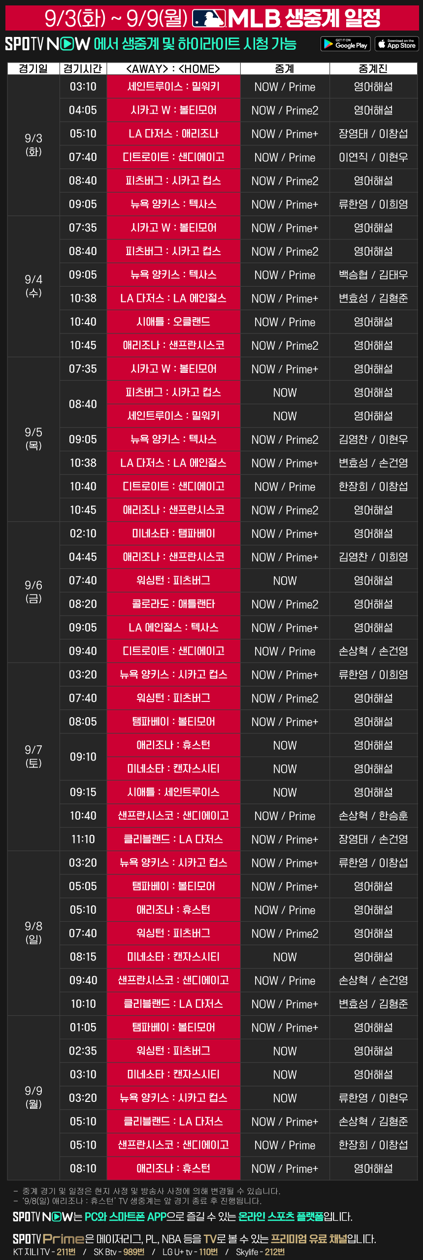 9/3(화) ~ 9/9(월) 2024 MLB 생중계 안내2024-09-02