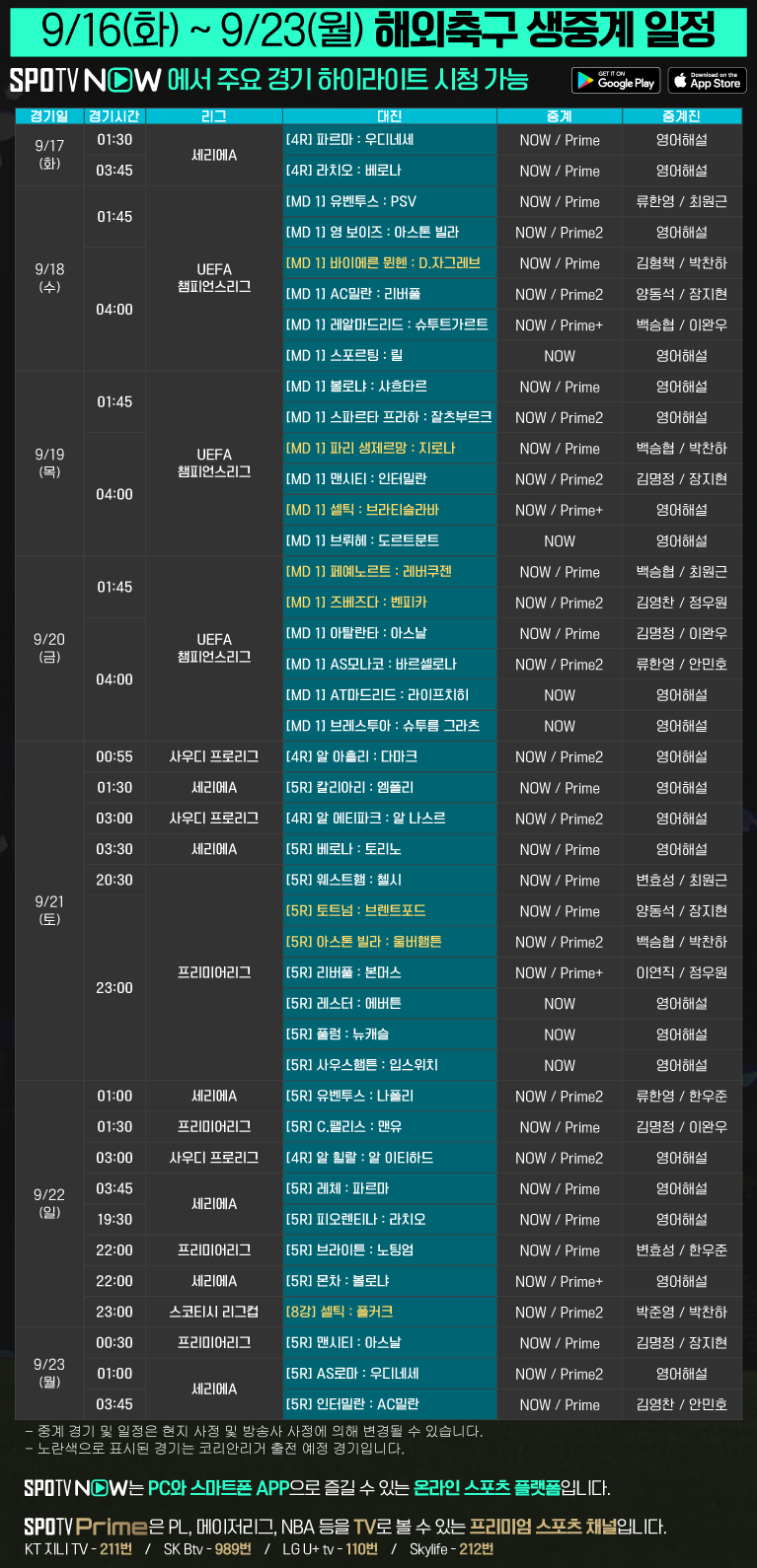 9/17(화) ~ 9/23(월) 해외축구 생중계 안내 (손흥민 중계 포함)2024-09-16