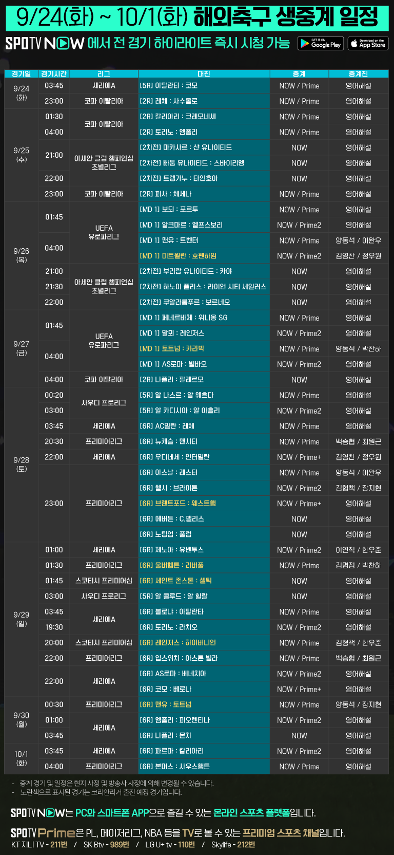 9/24(화) ~ 10/1(화) 해외축구 생중계 안내 (손흥민 경기 포함)2024-09-23