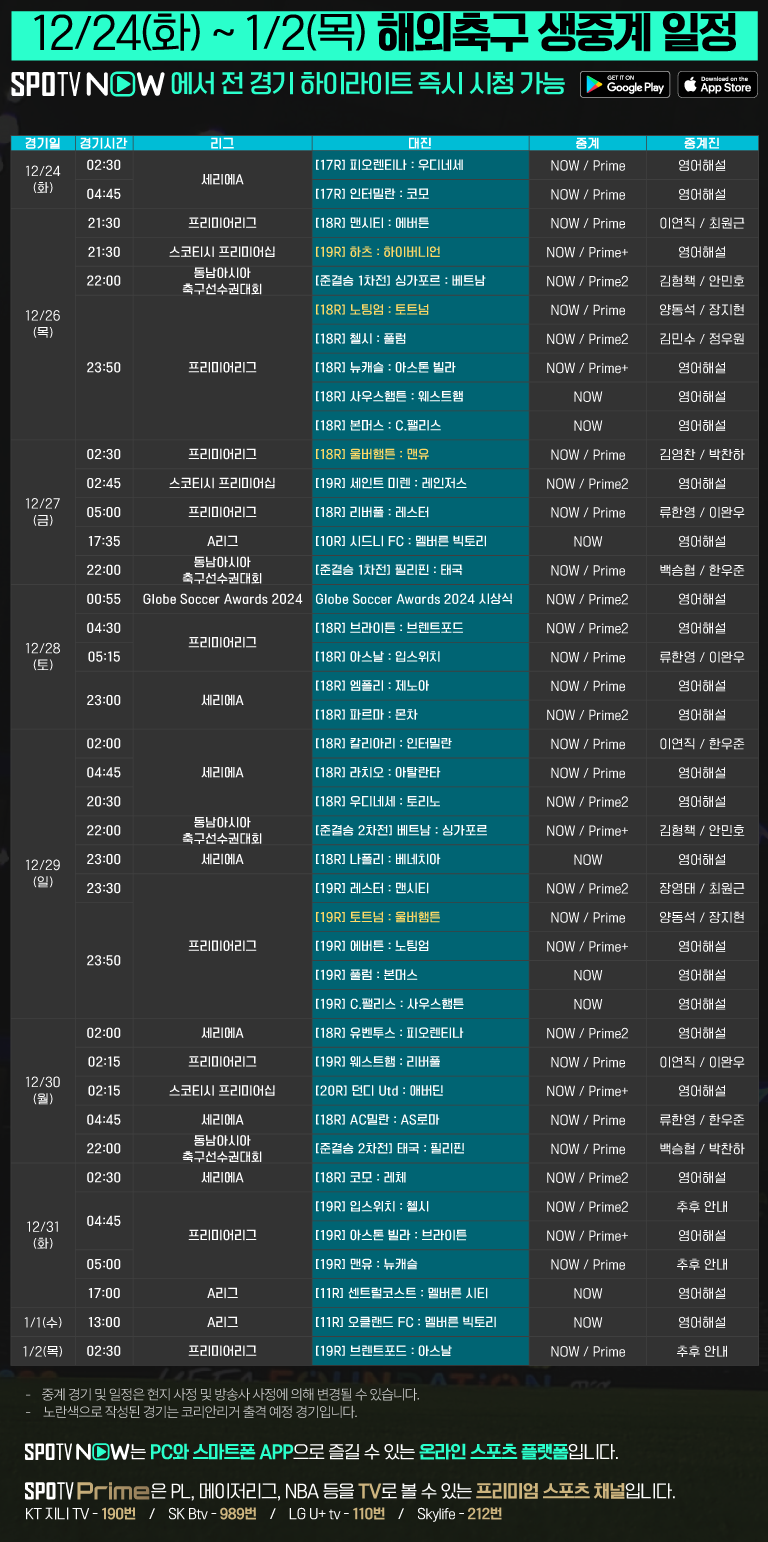 24-25 프리미어리그를 포함한 해외축구 주요 경기를 TV 채널 SPOTV Prime,