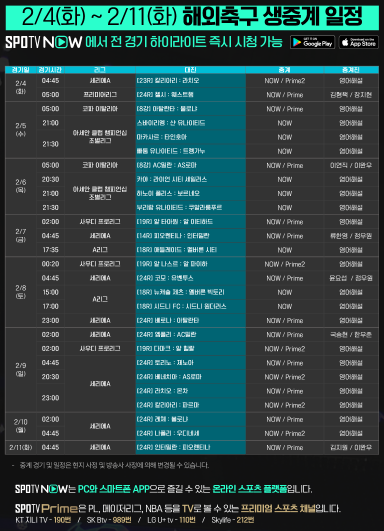 24-25 세리에A 주요경기를 TV 채널 SPOTV Prime과 '스포츠 OTT 서비스' SPOTV NOW에서 생중계로 만나보세요!