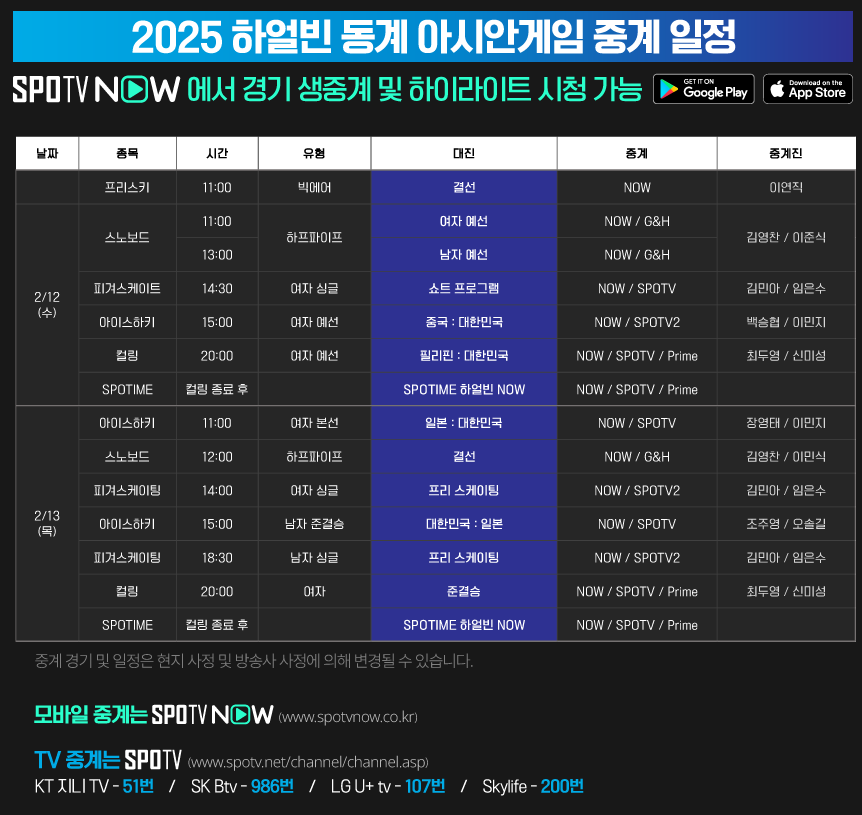 스포츠 전문 채널 SPOTV가 2025 하얼빈 동계 아시안게임을 중계합니다.