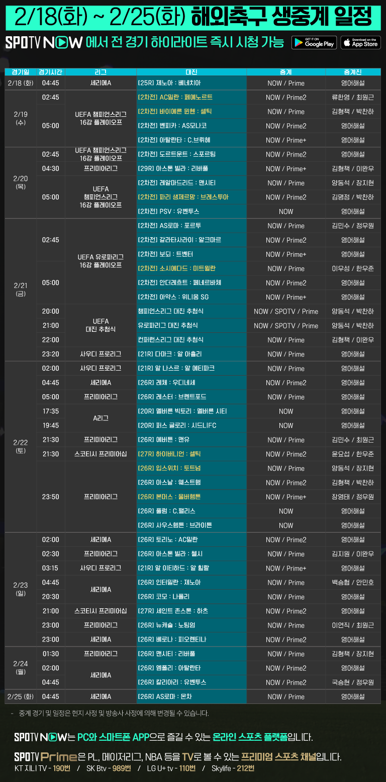 해외리그 주요 경기 생중계를 TV 채널 SPOTV Prime에서 만나보세요!