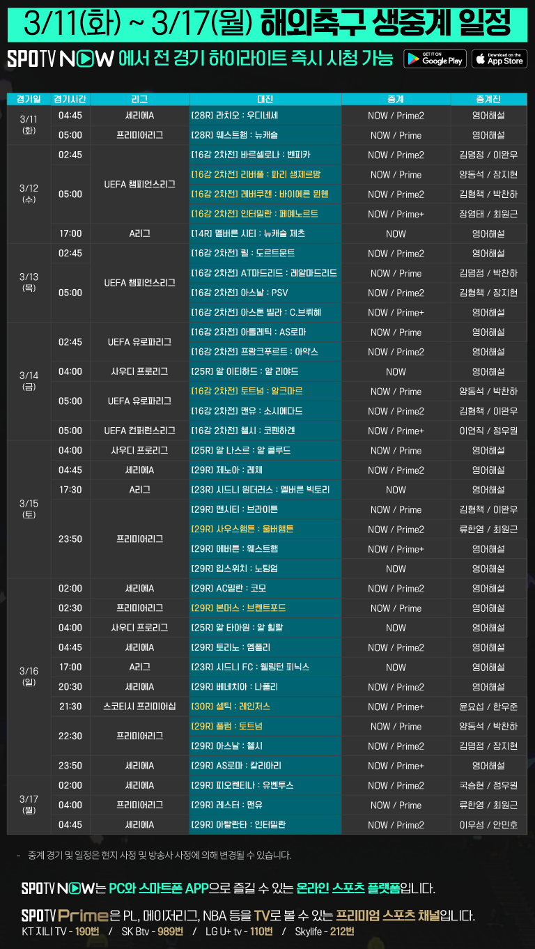 이외에도, 프리미어리그 29R부터 세리에A, 유로파리그 등 해외 주요 대회 경기 역시 시청 가능합니다.
