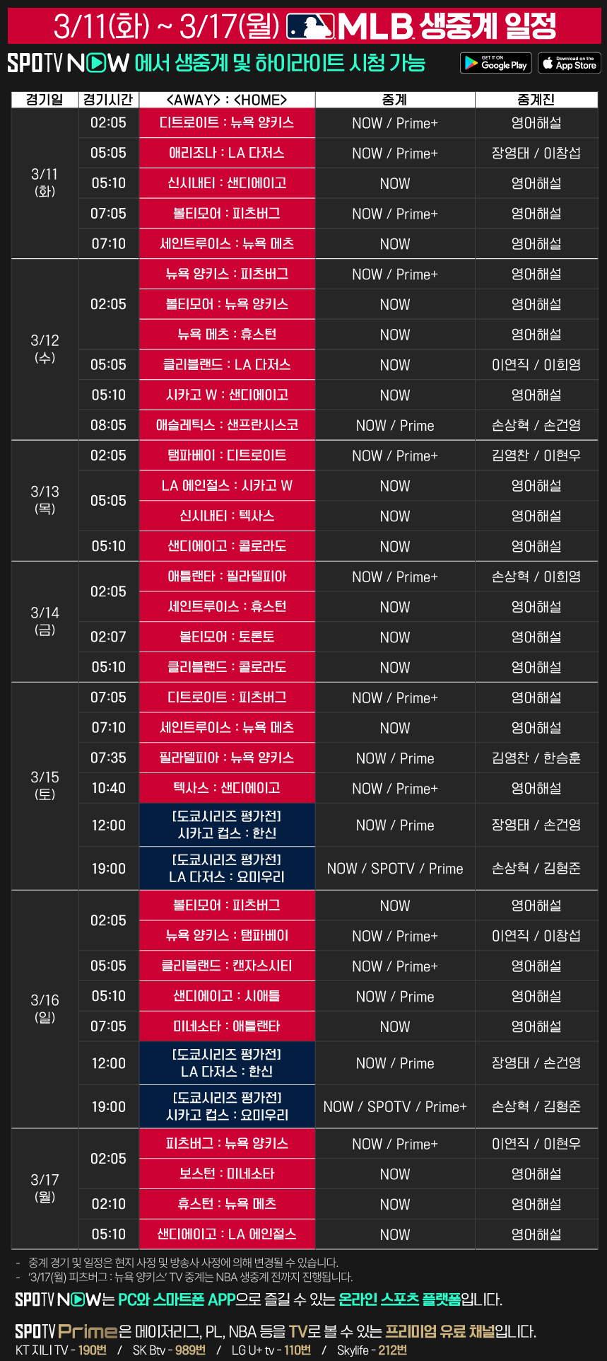 2025 메이저리그 시범경기 & 정규시즌 생중계는 SPOTV Prime, SPOTV NOW에서 만나 보세요.