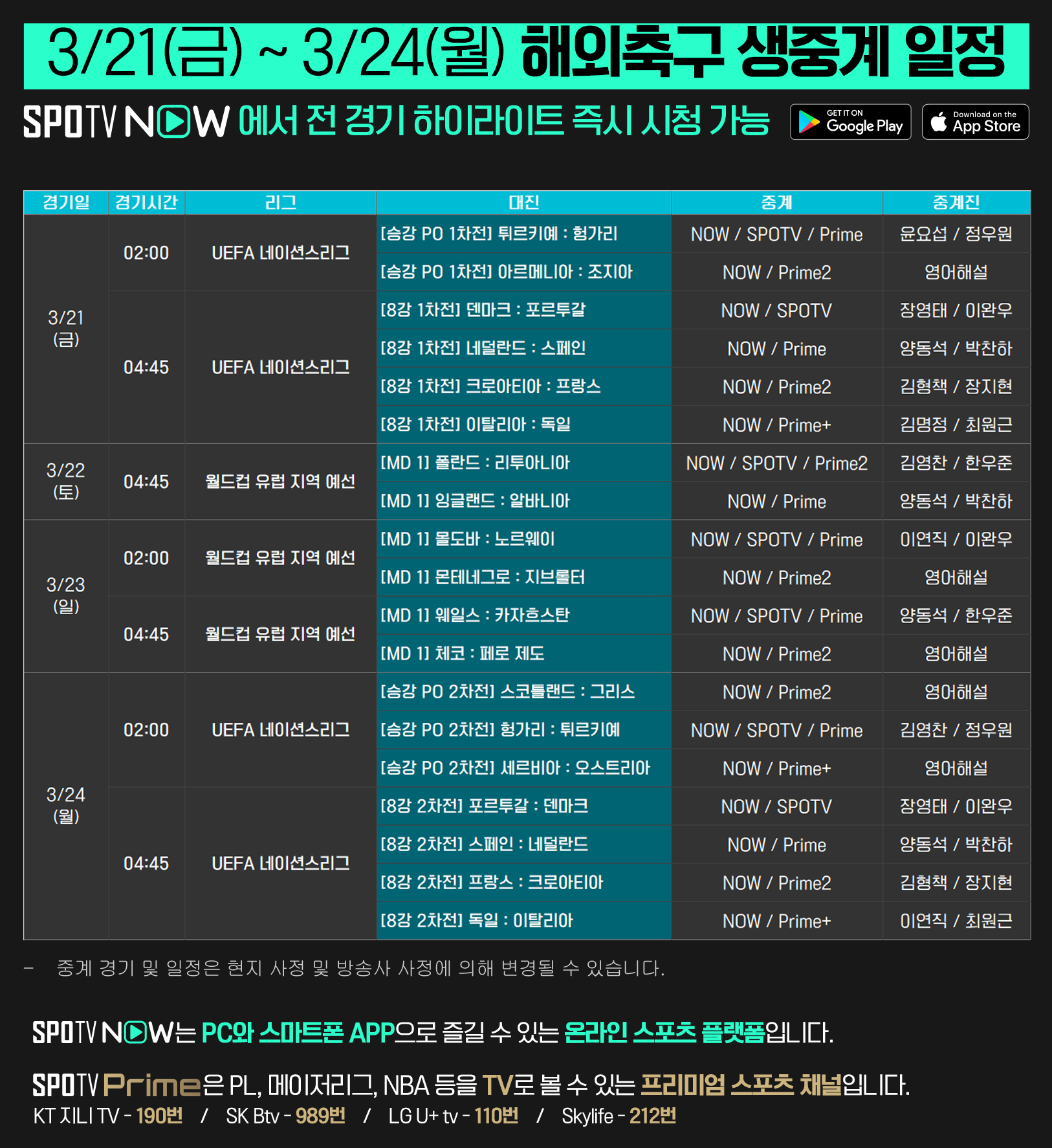UEFA 네이션스리그와 2026 FIFA 월드컵 유럽 지역 예선 경기를 TV 채널 SPOTV, SPOTV Prime에서 생중계로 만나보세요.