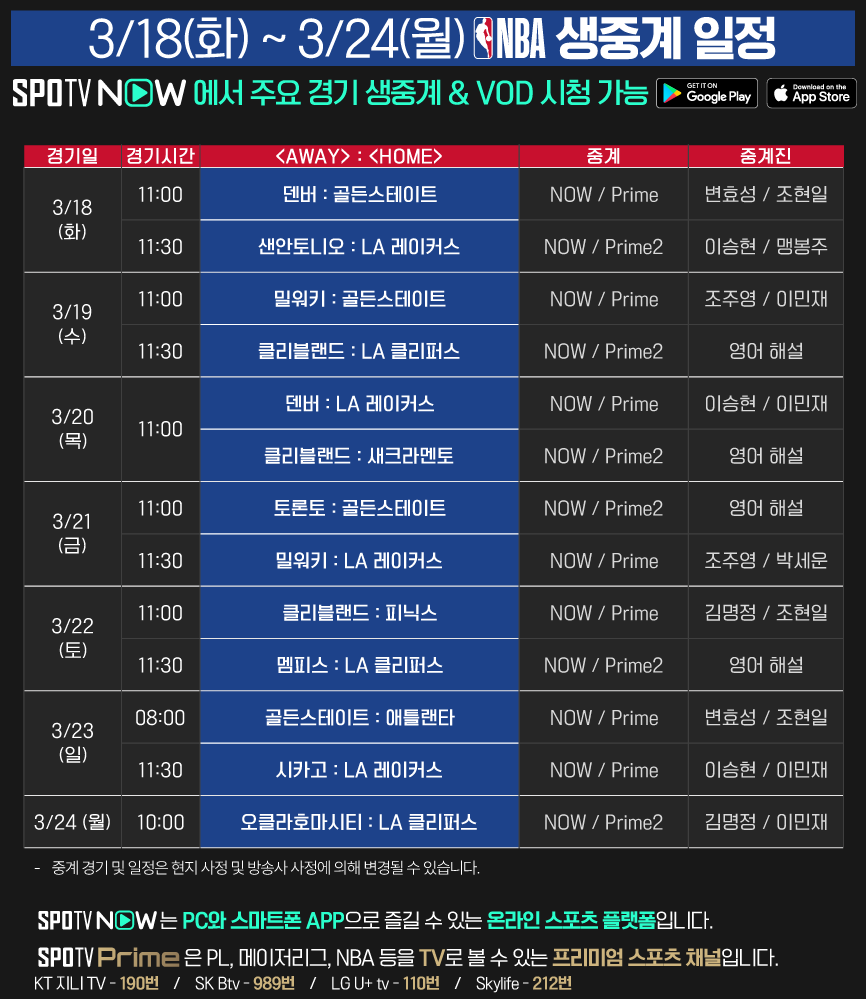 24-25 NBA PC/모바일 생중계는 SPOTV NOW에서 시청 가능합니다.