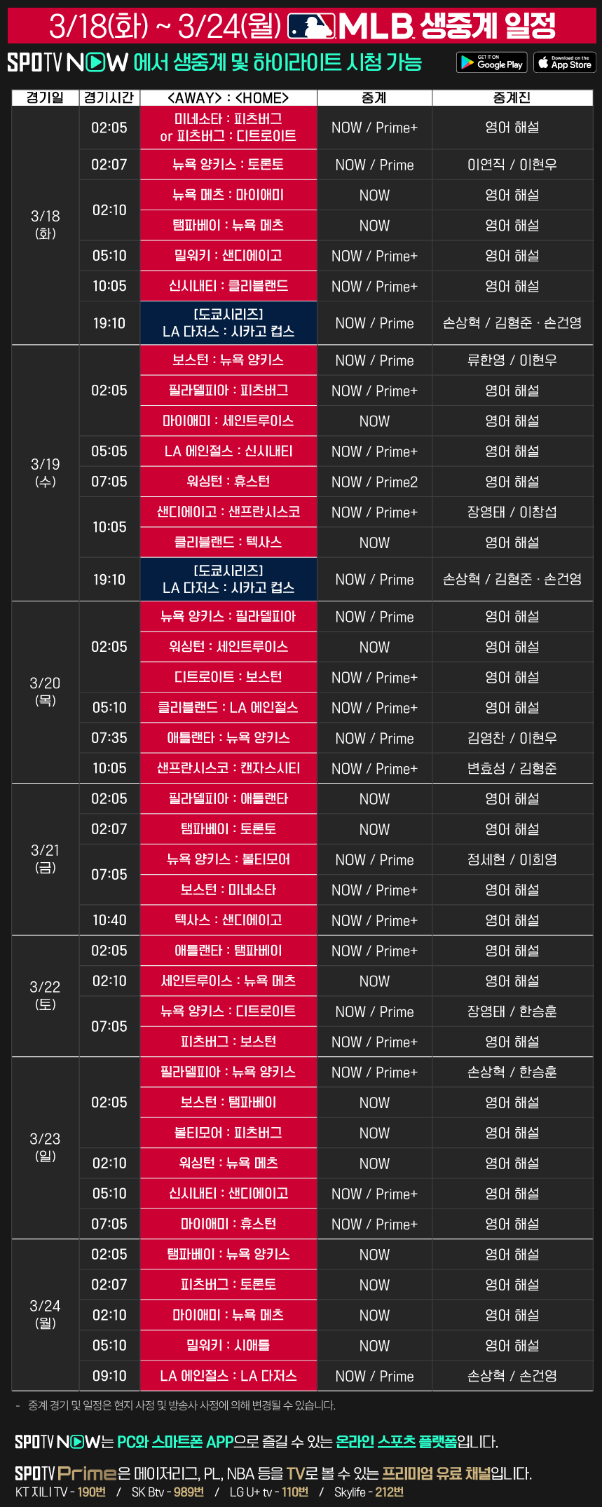 2025 메이저리그 시범경기 & 정규시즌 생중계는 SPOTV Prime, SPOTV NOW에서 만나 보세요.