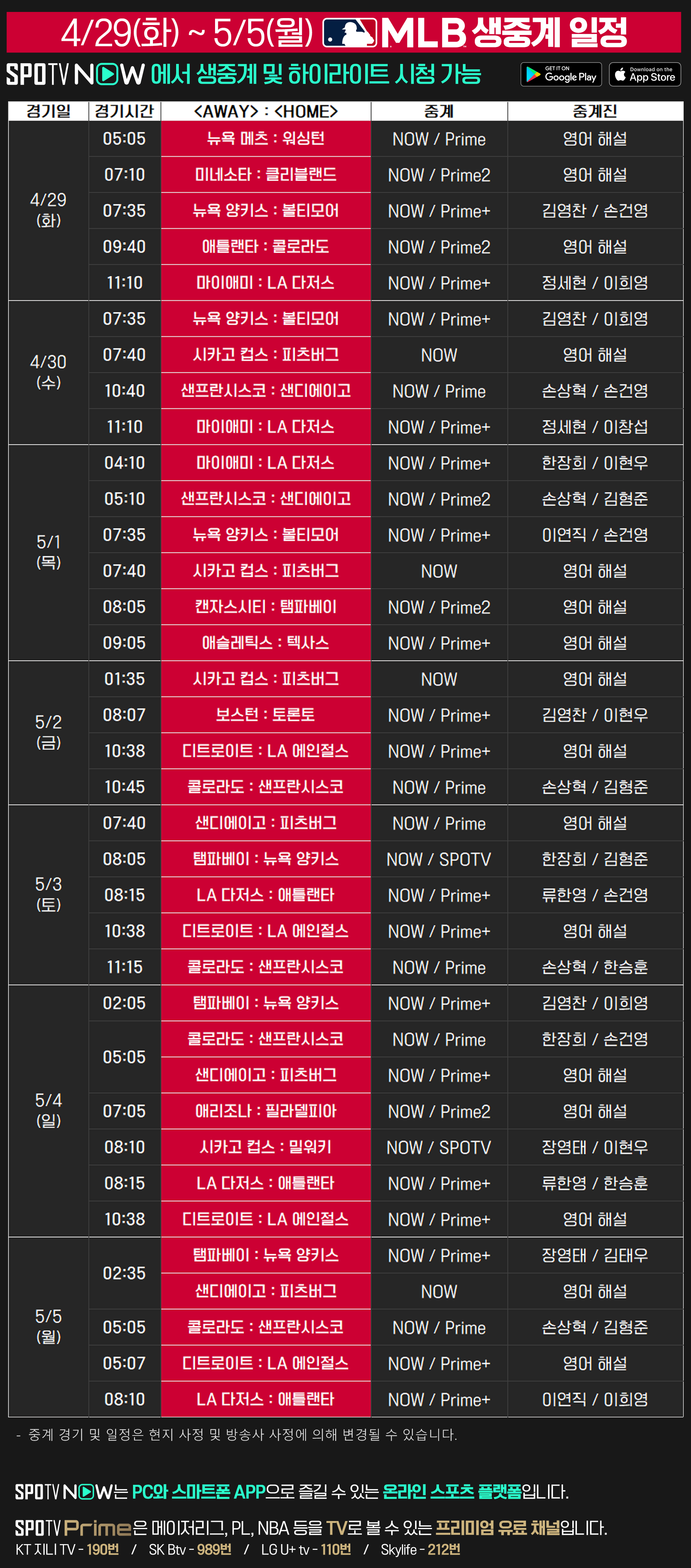 2025 메이저리그 정규시즌 주요 경기 생중계는 SPOTV Prime, SPOTV Prime2, SPOTV Prime+채널,