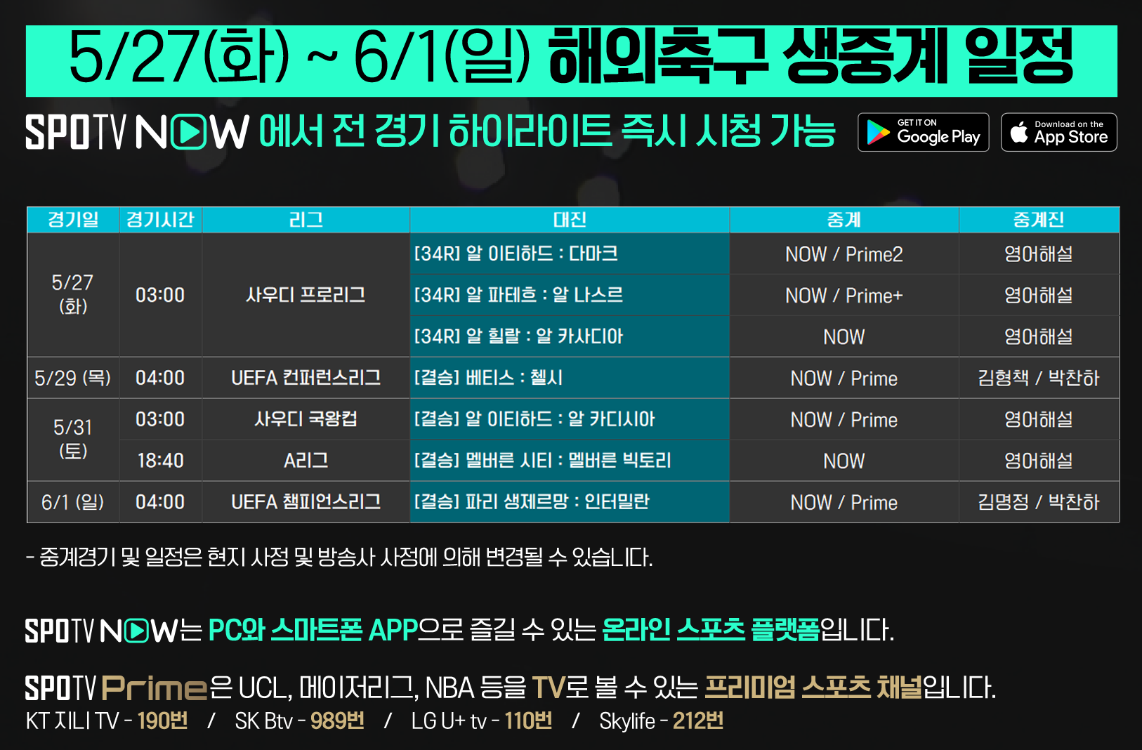 TV 채널 SPOTV Prime과 스포츠 OTT 서비스 SPOTV NOW에서 생중계될 예정입니다.