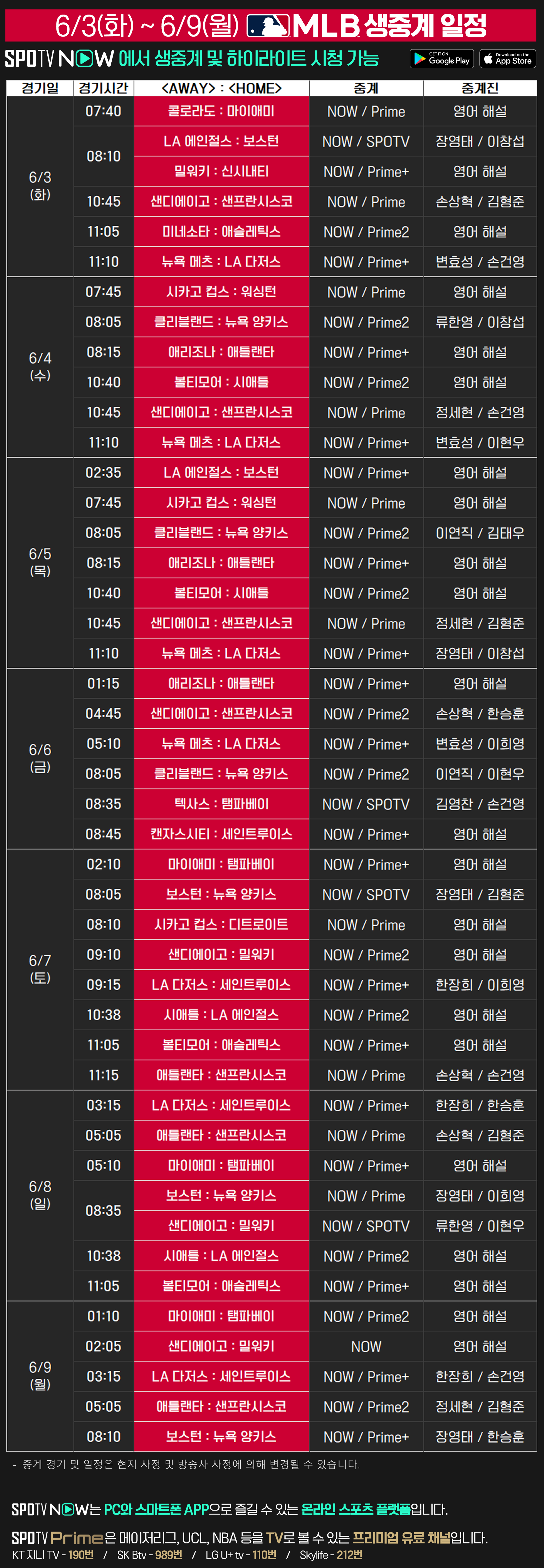 6/3(화) ~ 6/9(월) MLB 중계 일정 안내 (이정후 경기 중계)2025-06-02