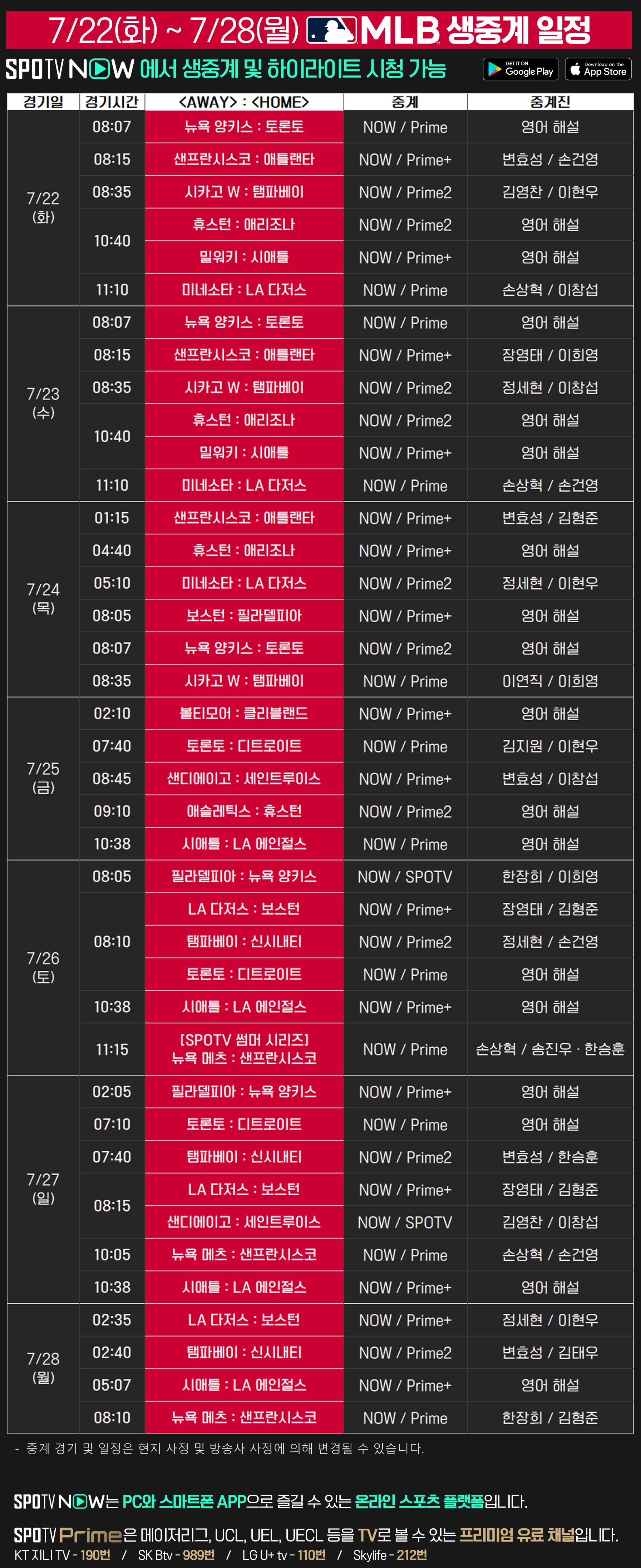 2025 메이저리그 정규시즌 주요 경기 생중계는 SPOTV Prime, SPOTV Prime2, SPOTV Prime+채널,