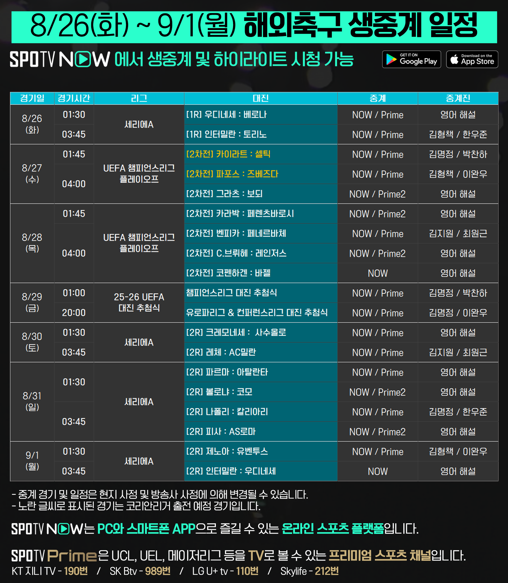 8/27(수) 01:45 UCL PO '카이라트 : 셀틱' & 8/27(수) 04:00 UCL PO '파포스 vs 즈베즈다'