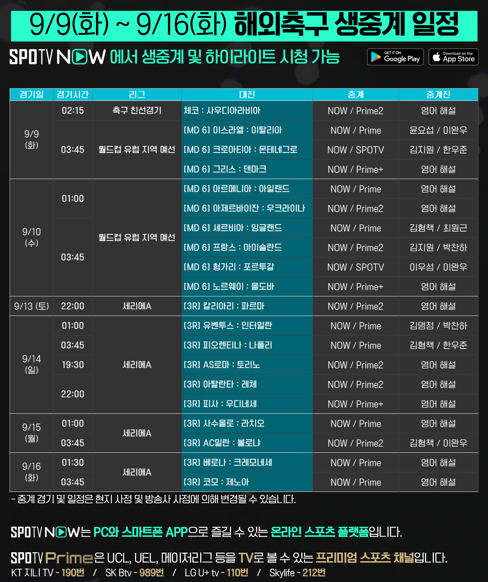 해외축구 주요 리그 및 대회 생중계는 TV 채널 SPOTV Prime과 '스포츠 OTT 서비스' SPOTV NOW에서 생중계됩니다.