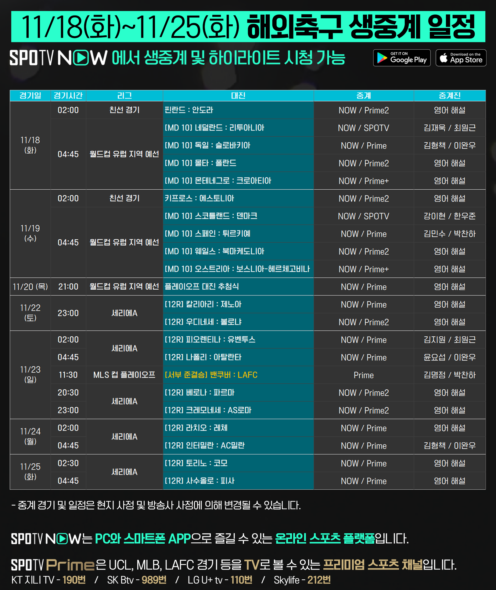 한편, LAFC에서 맹활약 중인 손흥민의 플레이오프 활약상 역시 TV 채널 SPOTV Prime에서 생중계됩니다.