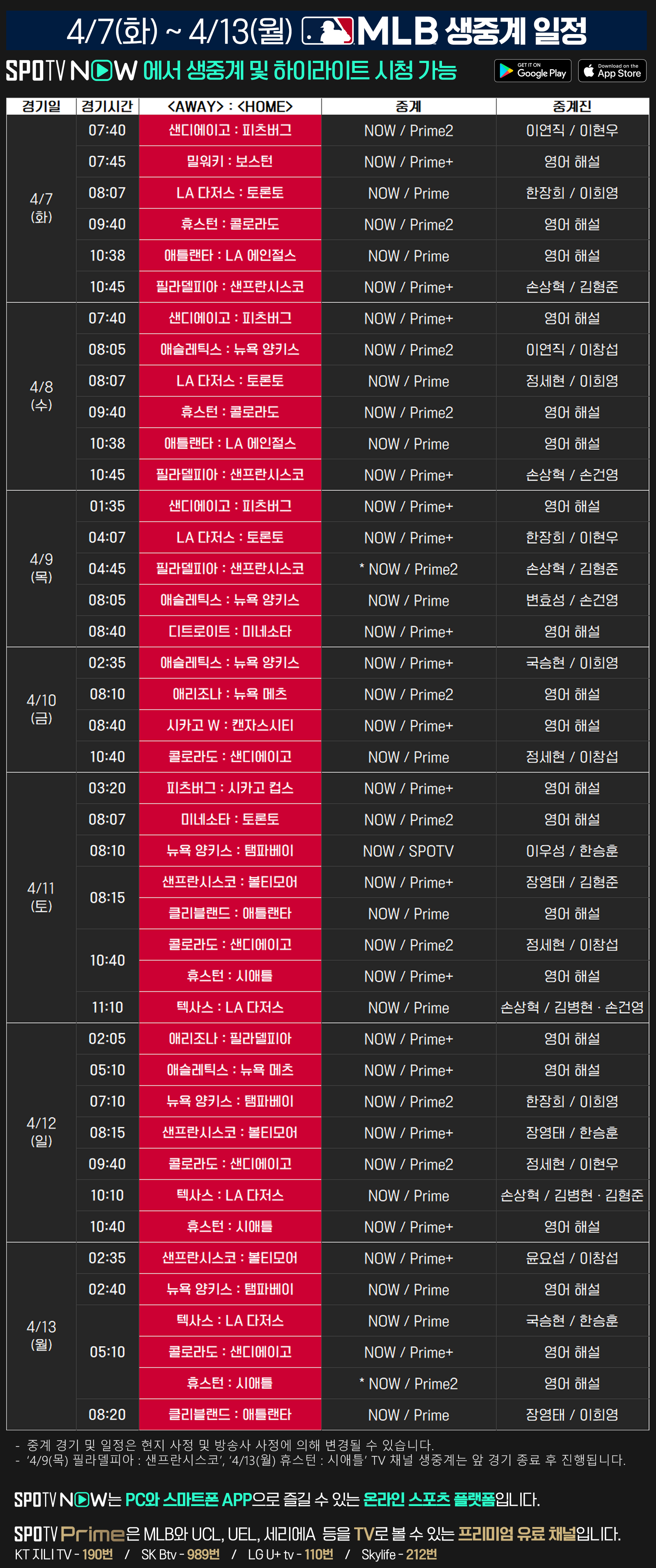 2026 메이저리그 주요 경기는 SPOTV Prime과 SPOTV NOW에서 시청하실 수 있습니다.