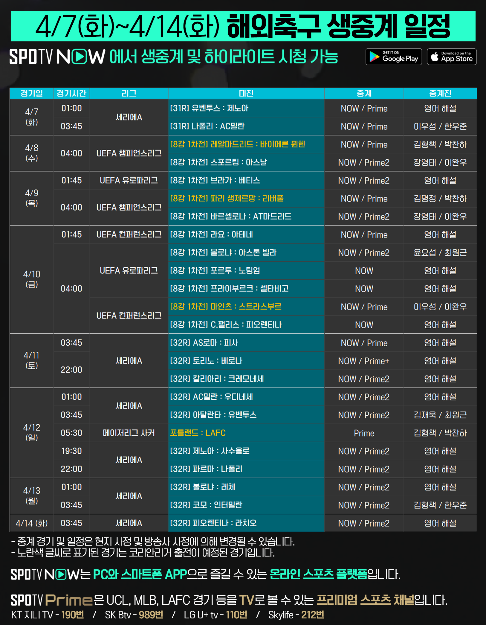 25-26 UEFA 챔피언스리그 8강 전 경기 생중계 및 유로파리그·컨퍼런스리그 8강 주요 경기 생중계를 SPOTV NOW와 SPOTV Prime에서 함께해 주세요.