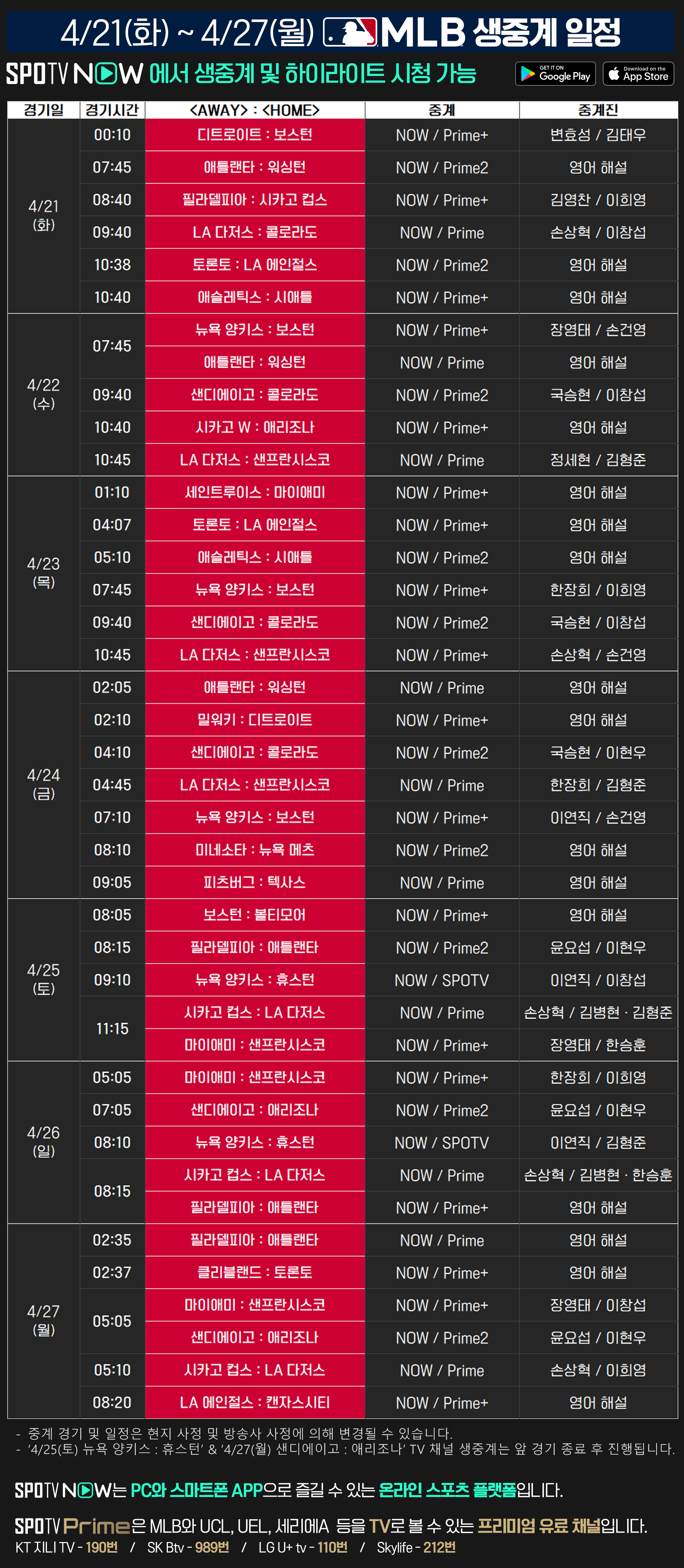 2026 메이저리그 주요 경기는 SPOTV Prime과 SPOTV NOW에서 시청하실 수 있습니다.