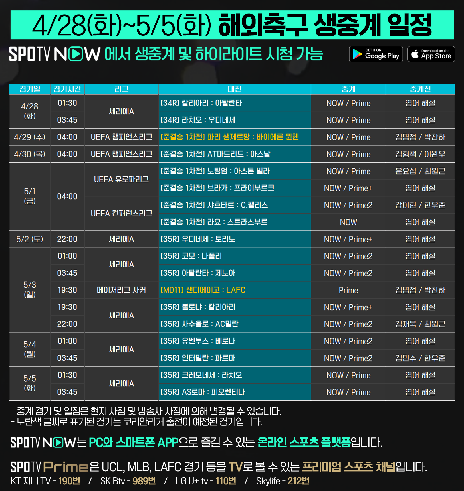 이강인과 김민재의 코리안 더비가 예정된 25-26 UEFA 챔피언스리그 준결승 전 경기 생중계를 SPOTV NOW, SPOTV Prime에서 함께해 주세요.