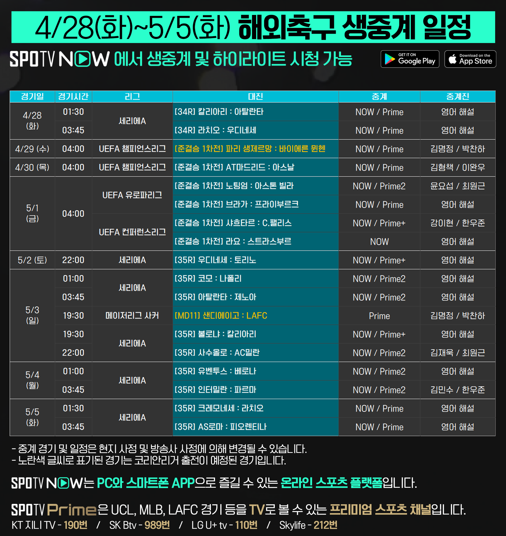 이강인과 김민재의 코리안 더비가 예정된 25-26 UEFA 챔피언스리그 준결승 전 경기 생중계를 SPOTV NOW, SPOTV Prime에서 함께해 주세요.